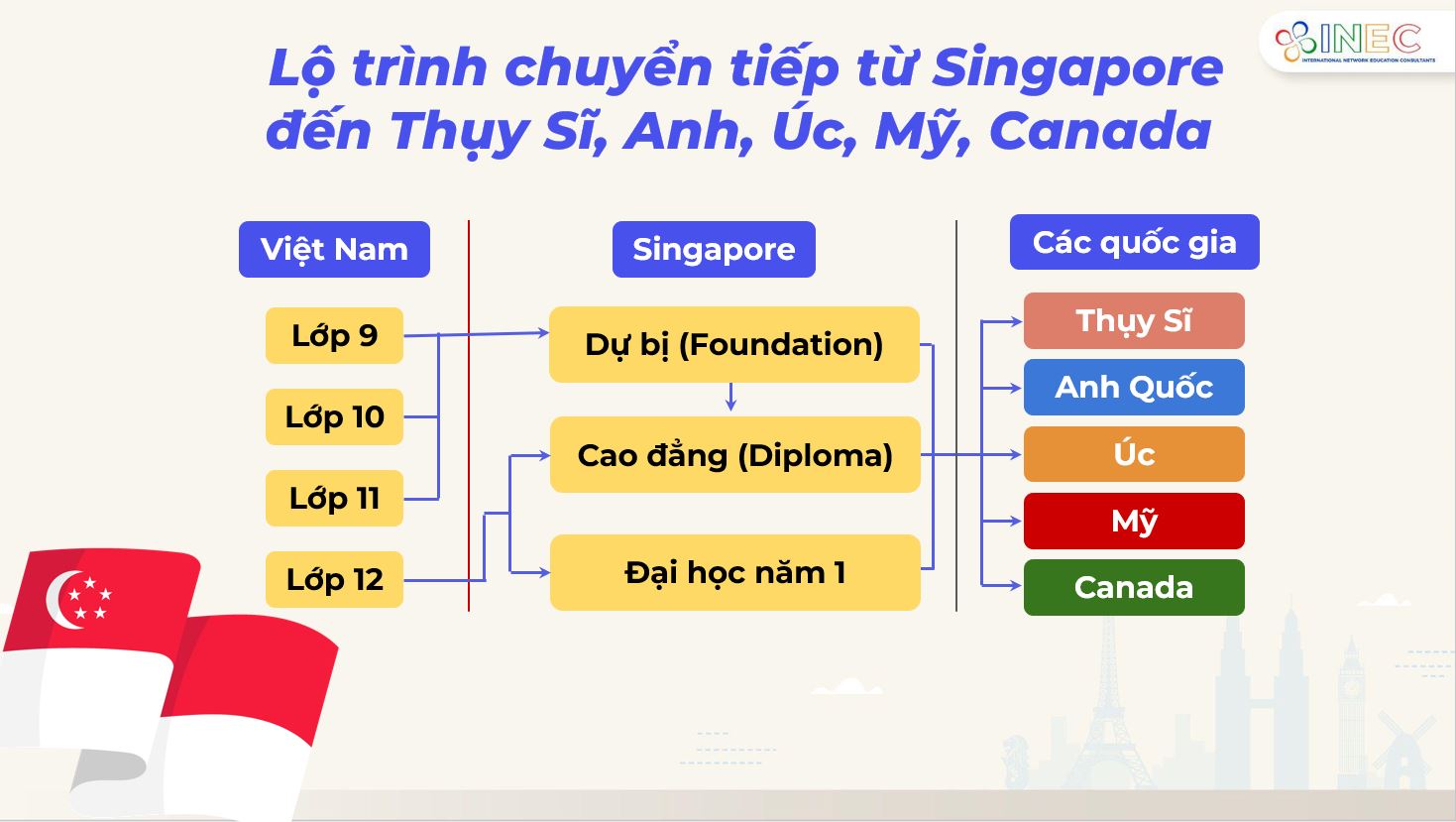 Với gần 20 năm kinh nghiệm, INEC là đối tác tuyển sinh uy tín của nhiều trường Singapore có mạng lưới liên thông quốc tế rộng lớn.